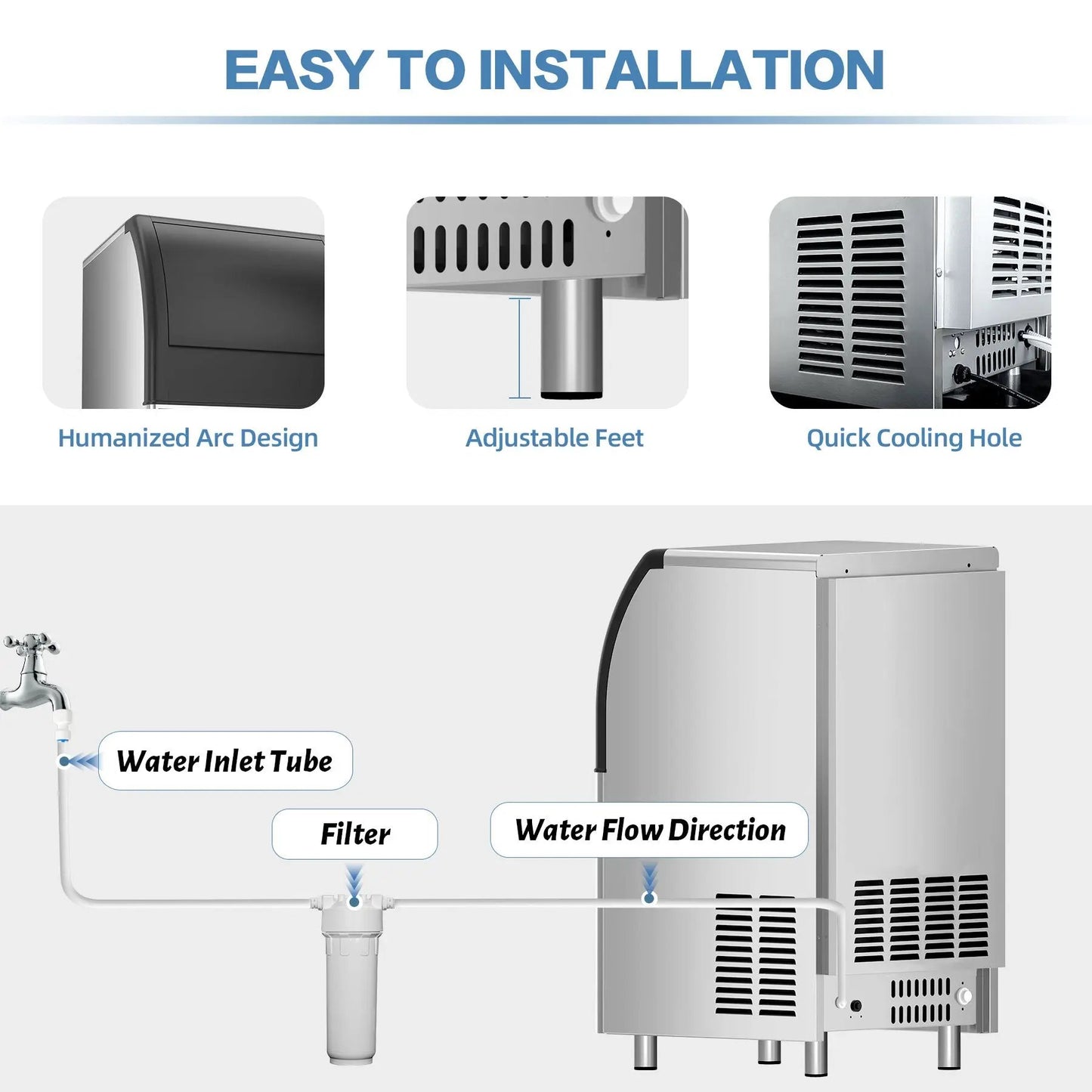 - ❄【Isolierter Eisraum】 Dieser kommerzielle Eisbereiter ist mit einer integrierten dicken Wärmedämmschaumschicht ausgestattet, sodass der gesamte Lagerraum über lange Zeit eine konstant niedrige Temperatur halten kann, wodurch das Schmelzen der Eiswürfel vermieden wird und Sie im heißen Sommer Stromkosten sparen können. Zu den integrierten Zubehörteilen gehören eine Eisschaufel, ein Wasserzulaufschlauch, ein Wasserreiniger und ein Ablaufschlauch. Alles, was Sie brauchen, ist vorhanden. Integriertes blaues Licht zur Gewährleistung Ihrer Lebensmittelsicherheit.