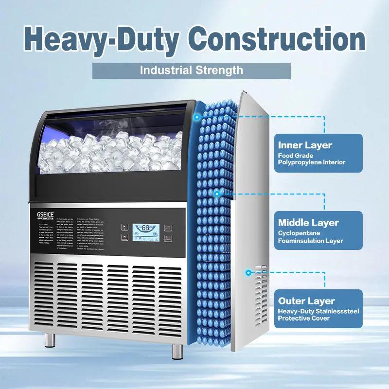 - ❄【Geringer Kohlenstoffausstoß, Umweltschutz, Energieeinsparung und geringer Verbrauch】 Das Problem der globalen Erwärmung kann nicht ignoriert werden. GSEICE setzt sich für den Umweltschutz ein. Diese kommerzielle Eismaschine verwendet das effiziente und umweltfreundliche Kältemittel R290a und erzeugt während des Betriebs keine Freon-Emissionen. Mit einem leistungsstärkeren Kompressor der weltberühmten Marke kann diese Eismaschine den Eisherstellungsprozess effektiv abschließen, ohne zu viel Lärm zu erzeugen.