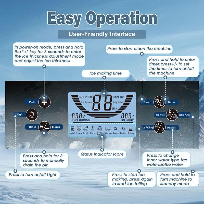 - ❄【Hochwertige Qualität】 Dieser Eisbereiter ist mit einem 4,3-Zoll-HD-LCD-Touchscreen ausgestattet und das Panel unterstützt die Wasserdichtigkeitsklasse IP66. Drücken Sie einfach die Eisherstellungstaste auf dem Bedienfeld und der Rest der Arbeit wird automatisch vom eingebauten Mikrocomputer gesteuert. Automatische Wasserzufuhr, automatischer Stopp, wenn das Eis voll ist, Zeitschalter und automatische Reinigung per Knopfdruck. Im heißen Sommer können Sie mit diesem kommerziellen Eisbereiter einen großen Eimer Eis herstellen und ein Eisbad genießen.
